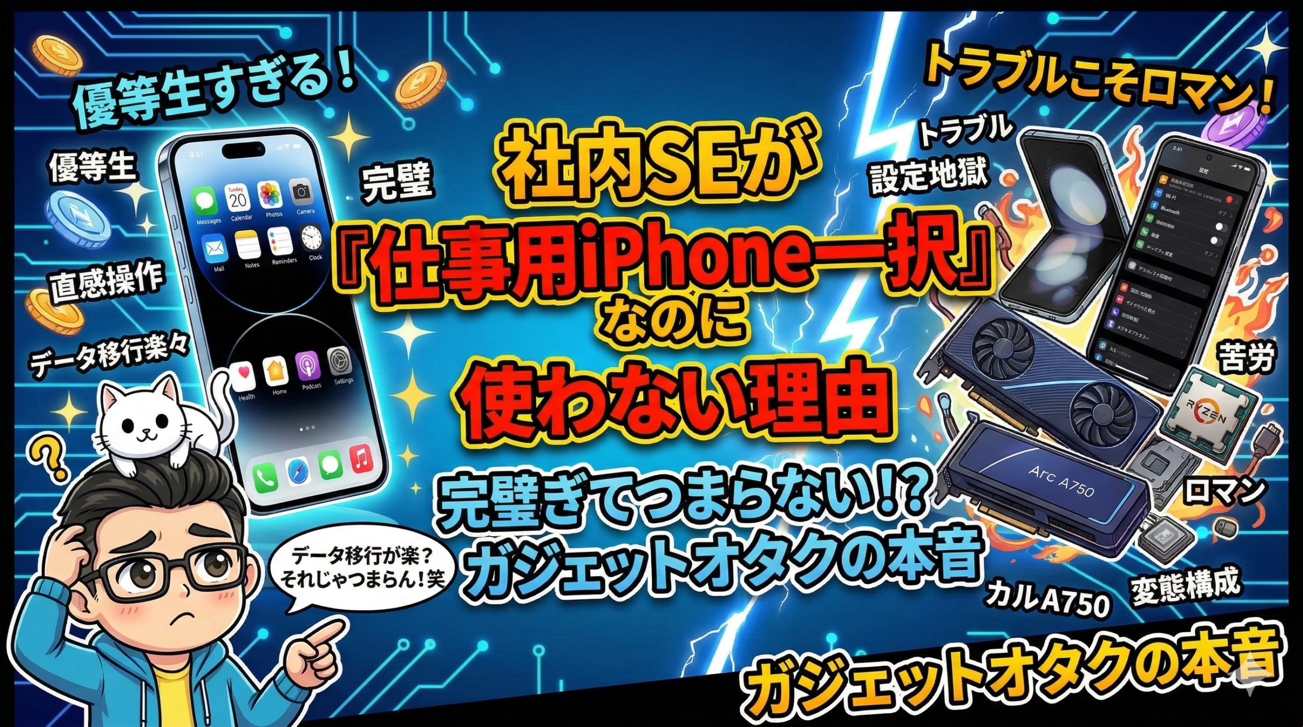 iPhoneという完璧な優等生と付き合うのは、確かに安心で快適です。でも私は、設定画面で迷子になったり、開くたびに両手が必要で面倒くさい折りたたみスマホ(Z Flip5)にロマンを感じてしまう、悲しきガジェットオタクなのです。