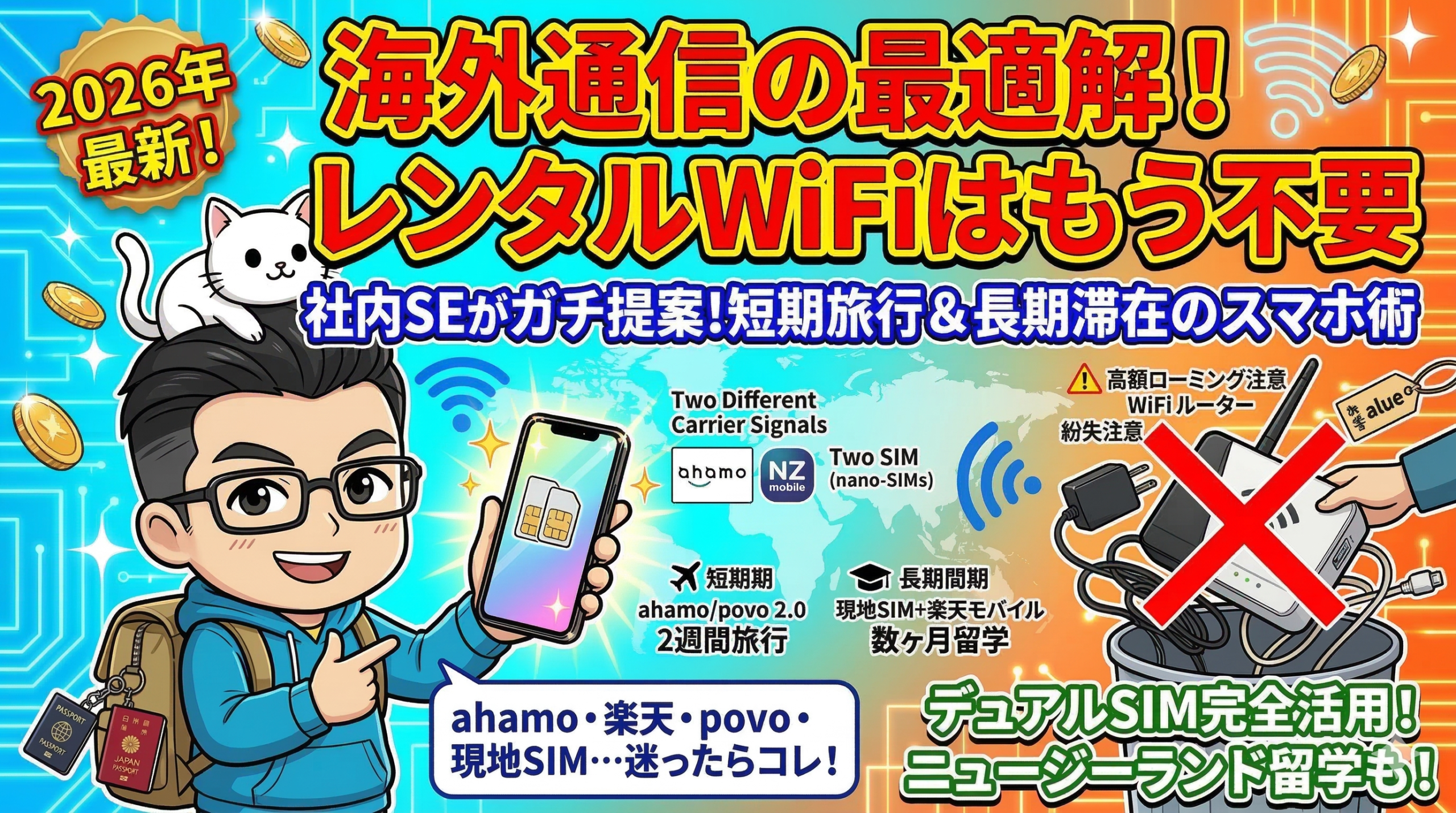 今回は、このデュアルSIM機能をフル活用して、社内SEの私が導き出した「海外通信SIMの最強の答え」を、短期と長期に分けて解説します!