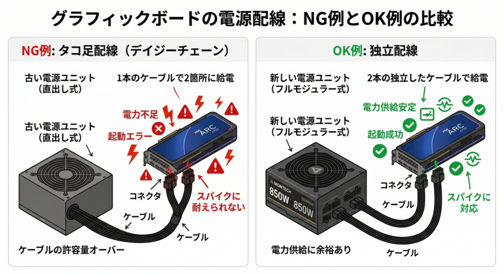 Intel Arc A750 8Gは非常に面白いグラボですが、起動時や高負荷時に瞬間的な大電力(トランジェントスパイク)を要求するシビアな一面があります。 古い電源の「12V出力上限(504W)」に対し、VGAケーブルを1本から2股に分ける「タコ足配線」で電力を供給していたため、起動時のスパイクに物理的に耐えきれず、電源側の安全装置が働いてシステムが落ちているのではないか、と推測しました。