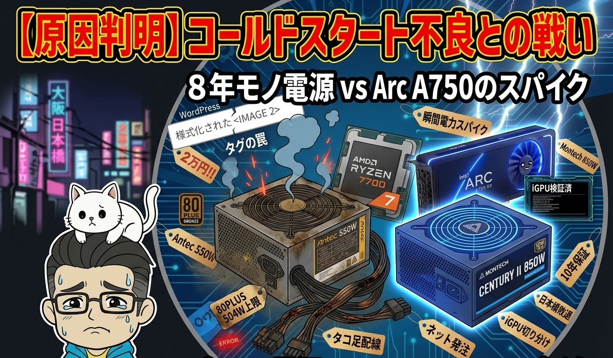 Intel Arc A750 8Gは非常に面白いグラボですが、起動時や高負荷時に瞬間的な大電力(トランジェントスパイク)を要求するシビアな一面があります。 古い電源の「12V出力上限(504W)」に対し、VGAケーブルを1本から2股に分ける「タコ足配線」で電力を供給していたため、起動時のスパイクに物理的に耐えきれず、電源側の安全装置が働いてシステムが落ちているのではないか、と推測しました。