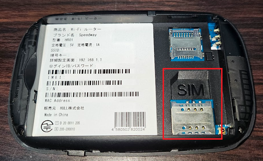 そして最大の難関が*標準SIMサイズのスロット」でした。 今どきのスマホはすべて極小のNano SIMなので、当然変換アダプタを使います。W03のように「まっすぐ差し込むタイプ」ならアダプタに乗せるだけで簡単なのですが、HR-01は「金属端子を下向きにして、スロットへスライドさせて差し込む」という極悪仕様。